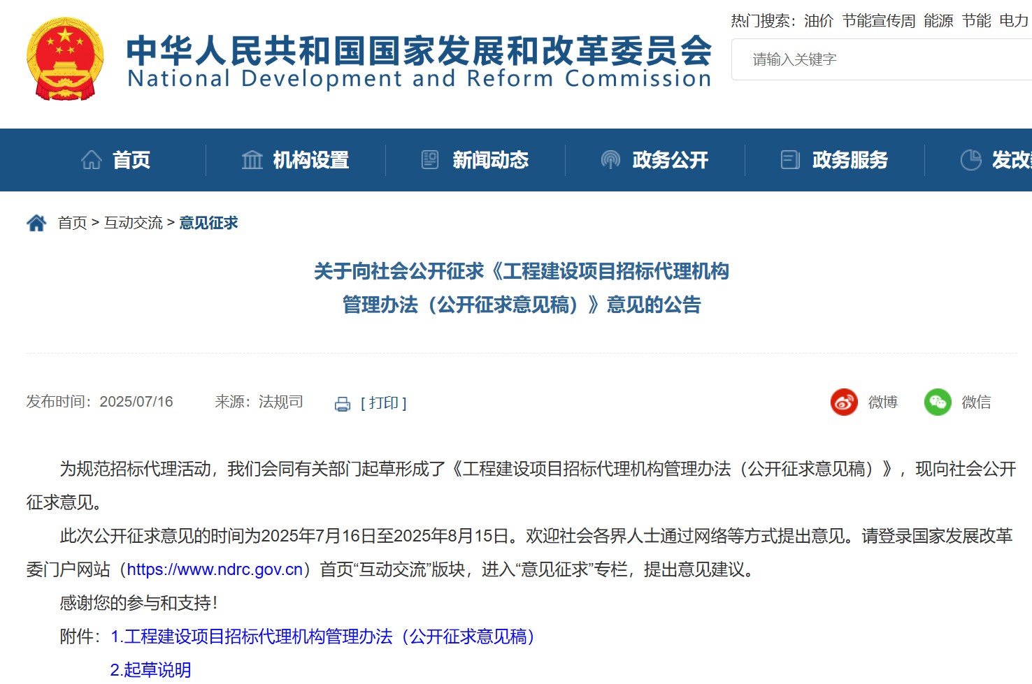 為規(guī)范招標(biāo)代理活動,國家發(fā)展和改革委員會會同有關(guān)部門起草形成了《工程建設(shè)項(xiàng)目招標(biāo)代理機(jī)構(gòu)管理辦法(公開征求意見稿)》,現(xiàn)向社會公開征求意見。此次公開征求意見的時間為2025年7月16日至2025年8月15日。
