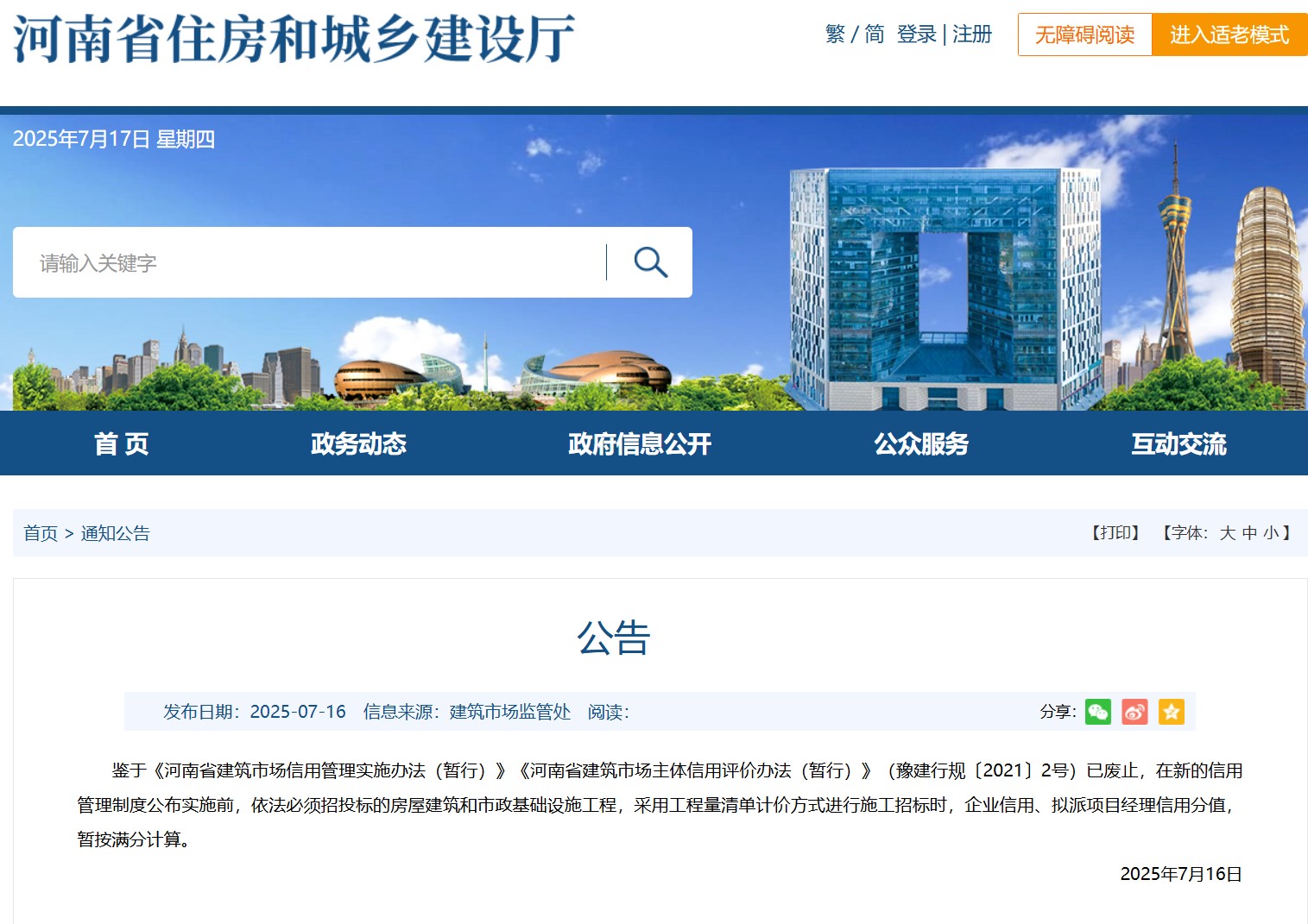 河南省住建廳發(fā)布關(guān)于房建、市政施工項(xiàng)目招標(biāo)時信用分計算的公告
